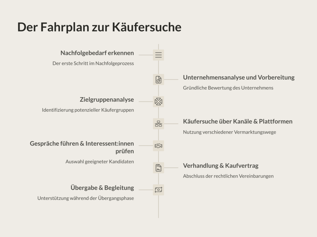 Die Suche nach einem Käufer ist kein Zufallsprodukt, sondern ein strategischer Prozess. Erfolgreiche Übergaben setzen eine fundierte Vorbereitung, klare Kommunikation und professionelle Begleitung voraus. Hier sind die wichtigsten Schritte: